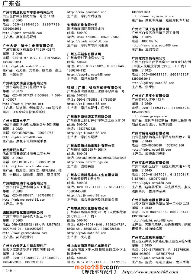 這兩年行業調整力度非常大,為了確保我們提供的信息準確性,我們本著寧缺毋濫的原則,不去圖虛的數量。目前摩托車與配件行業的不少經銷商是跨行業經營的,所以我們在本書中增加了部分摩托車整車廠、電動車生產廠、機動三輪車制造廠。所選的這些企業都是這個行業具有影響力的品牌企業,是為了大家在使用這本書時,獲取相關的延伸產業更多的實用信息。