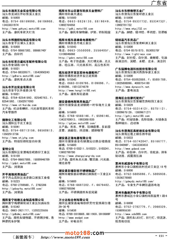 這兩年行業調整力度非常大,為了確保我們提供的信息準確性,我們本著寧缺毋濫的原則,不去圖虛的數量。目前摩托車與配件行業的不少經銷商是跨行業經營的,所以我們在本書中增加了部分摩托車整車廠、電動車生產廠、機動三輪車制造廠。所選的這些企業都是這個行業具有影響力的品牌企業,是為了大家在使用這本書時,獲取相關的延伸產業更多的實用信息。