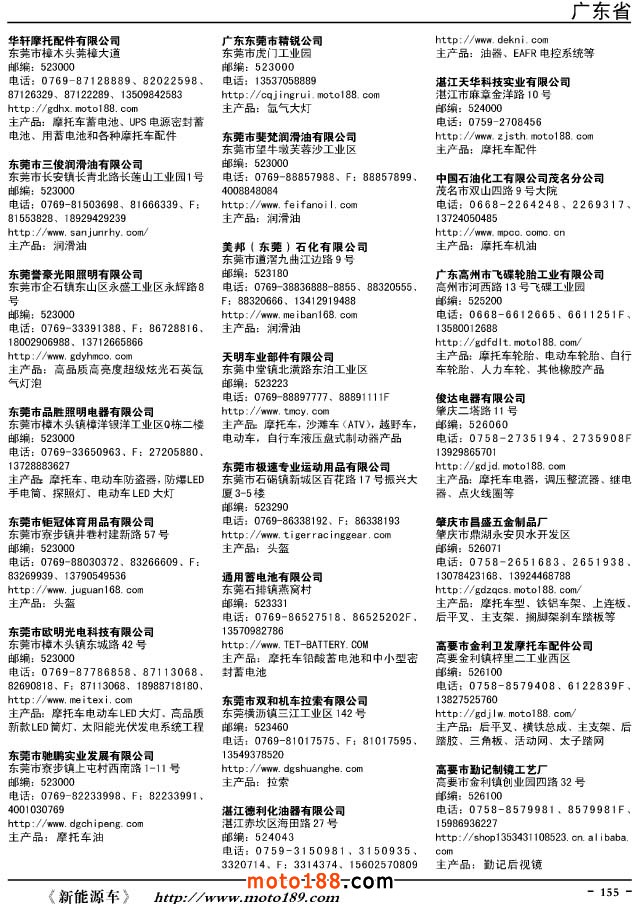 這兩年行業調整力度非常大,為了確保我們提供的信息準確性,我們本著寧缺毋濫的原則,不去圖虛的數量。目前摩托車與配件行業的不少經銷商是跨行業經營的,所以我們在本書中增加了部分摩托車整車廠、電動車生產廠、機動三輪車制造廠。所選的這些企業都是這個行業具有影響力的品牌企業,是為了大家在使用這本書時,獲取相關的延伸產業更多的實用信息。