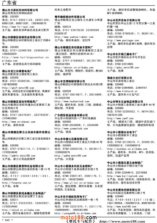 這兩年行業(yè)調(diào)整力度非常大,為了確保我們提供的信息準(zhǔn)確性,我們本著寧缺毋濫的原則,不去圖虛的數(shù)量。目前摩托車與配件行業(yè)的不少經(jīng)銷商是跨行業(yè)經(jīng)營的,所以我們在本書中增加了部分摩托車整車廠、電動車生產(chǎn)廠、機動三輪車制造廠。所選的這些企業(yè)都是這個行業(yè)具有影響力的品牌企業(yè),是為了大家在使用這本書時,獲取相關(guān)的延伸產(chǎn)業(yè)更多的實用信息。