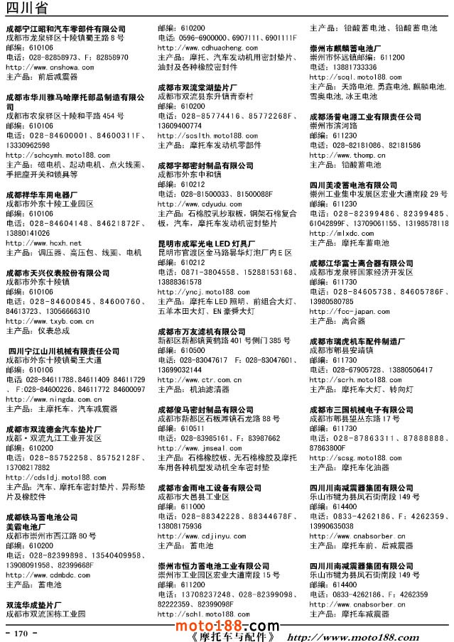 這兩年行業調整力度非常大,為了確保我們提供的信息準確性,我們本著寧缺毋濫的原則,不去圖虛的數量。目前摩托車與配件行業的不少經銷商是跨行業經營的,所以我們在本書中增加了部分摩托車整車廠、電動車生產廠、機動三輪車制造廠。所選的這些企業都是這個行業具有影響力的品牌企業,是為了大家在使用這本書時,獲取相關的延伸產業更多的實用信息。