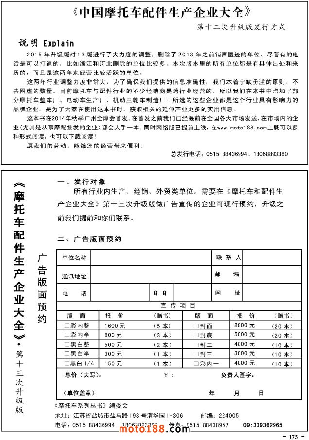這兩年行業調整力度非常大,為了確保我們提供的信息準確性,我們本著寧缺毋濫的原則,不去圖虛的數量。目前摩托車與配件行業的不少經銷商是跨行業經營的,所以我們在本書中增加了部分摩托車整車廠、電動車生產廠、機動三輪車制造廠。所選的這些企業都是這個行業具有影響力的品牌企業,是為了大家在使用這本書時,獲取相關的延伸產業更多的實用信息。