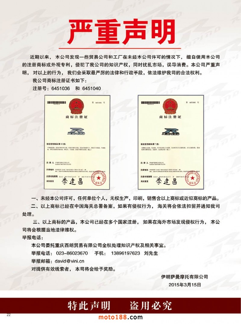 今年第四期雜志雖然在全國市場都有發(fā)行,一些不在市場的地區(qū)商戶除了通過www.moto188.com網(wǎng)站閱讀,也可到我們展位直接領(lǐng)取。由于本期雜志需要宣傳的企業(yè)較多,原來的摩托車及電動車行業(yè)的資訊的內(nèi)容,順延到下一期發(fā)布。