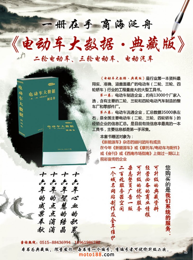 另外我們還帶來(lái)不多的《電動(dòng)車(chē)大數(shù)據(jù)》制造和流通卷,這是我們?nèi)ザ翊旱膭趧?dòng)成果,這部分書(shū)因?yàn)闆](méi)有廣告所以要收費(fèi)的,大會(huì)促銷(xiāo)價(jià)500元/套上下卷,一共5萬(wàn)多家單位,數(shù)據(jù)的準(zhǔn)確率在98%以上,每一個(gè)電話(huà)號(hào)碼都進(jìn)行核對(duì)過(guò)。今年做我們前彩宣傳的企業(yè)都可以獲贈(zèng)此書(shū),如果有既從事摩托車(chē)行業(yè),也從事電動(dòng)車(chē)及配件行業(yè)的企業(yè),這套書(shū)還是非常有價(jià)值的。