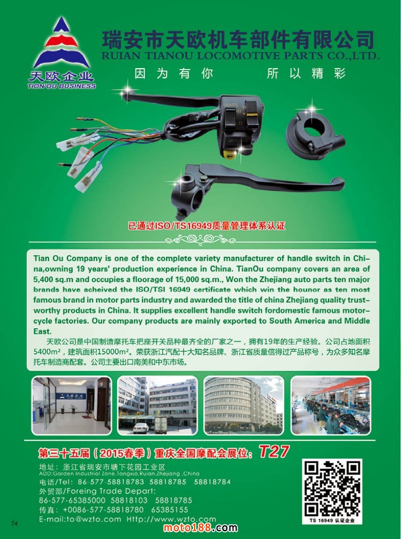 2015年的春天姍姍來遲,行業的盛會卻已盛裝已待。今春我們聚集在中國也是世界最大的摩托車配件生產基地重慶。目前行業形勢一如國家的經濟形勢依然嚴峻,但是我們摩配行業的從業人員,頂住困難以堅韌不拔的毅力,不離不棄奮斗在這個行業,通過重慶這樣一個大的展示平臺展示我們行業的精氣神。我們也帶來了這半年的勞動成果,和大家分享。