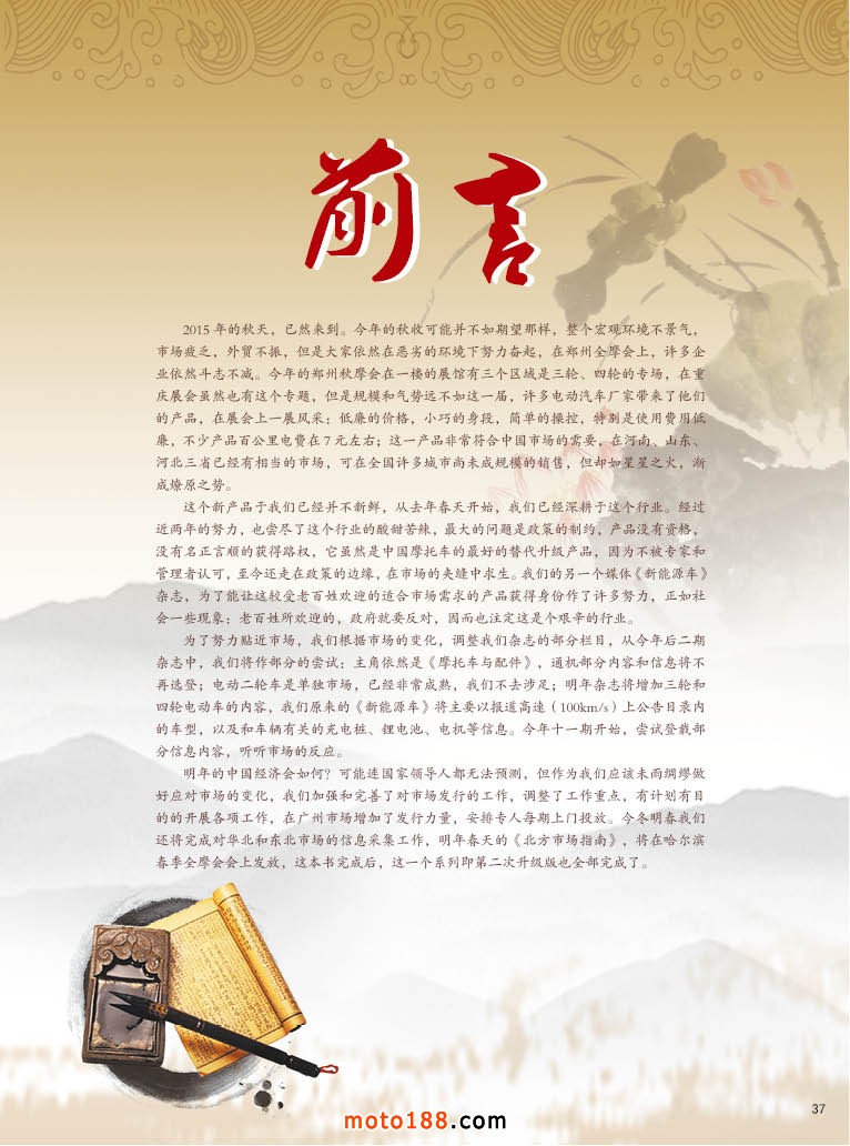 為了努力貼近市場(chǎng),我們根據(jù)市場(chǎng)的變化,調(diào)整我們雜志的部分欄目,從今年后二期雜志中,我們將作部分的嘗試:主角依然是《摩托車(chē)與配件》,通機(jī)部分內(nèi)容和信息將不再選登;電動(dòng)二輪車(chē)是單獨(dú)市場(chǎng),已經(jīng)非常成熟,我們不去涉足;明年雜志將增加三輪和四輪電動(dòng)車(chē)的內(nèi)容,我們?cè)瓉?lái)的《新能源車(chē)》將主要以報(bào)道高速(100km/s)上公告目錄內(nèi)的車(chē)型,以及和車(chē)輛有關(guān)的充電樁、鋰電池、電機(jī)等信息。今年十一期開(kāi)始,嘗試登載部分信息內(nèi)容,聽(tīng)聽(tīng)市場(chǎng)的反應(yīng)。