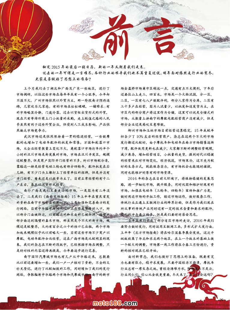 柳州市場和玉林市場目前經營還算穩定,15年底較年初各少了10%左右的經營商戶。雜志在這兩個不大的市場發行都還比較好,由于摩托車和電動車在南方市場銷售逐漸下滑,配件使用更新也在減少,大家都不斷的調整經營規模,減少庫存,增加經營項目,小批量的走貨,微利時代以穩健的經營來應對市場變化,經濟低迷,市場寒冷,這不失為較好的生存方式,既能保存實力,有市場機會也能隨時捕捉,同時也能維護好原有的市場資源。