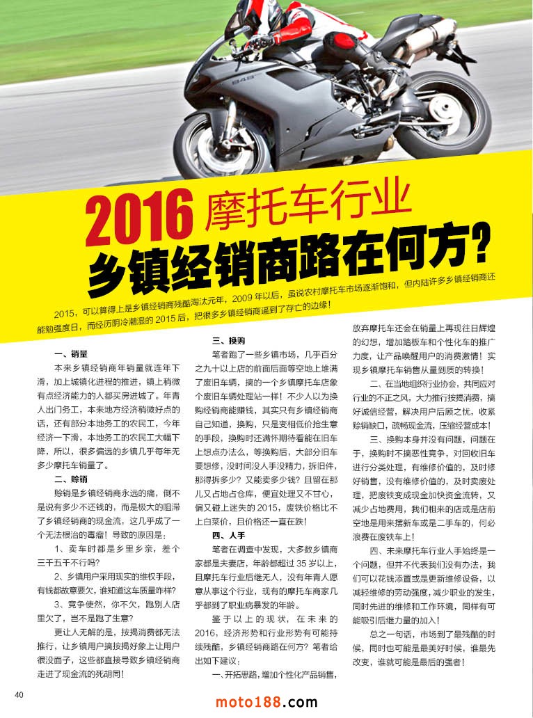 2016年的雜志在目前大環(huán)境下,將保持穩(wěn)健的發(fā)展思路,進(jìn)一步細(xì)化市場,提升服務(wù)。同時(shí)鞏固和維護(hù)好現(xiàn)有的市場。加強(qiáng)在電動(dòng)車(三輪車、四輪車)宣傳和推廣力度,做好周邊市場的開拓工作,貼近市場運(yùn)作,做好服務(wù)工作。傳統(tǒng)行業(yè)正遇上互聯(lián)網(wǎng)行業(yè)的跨界打劫,但是作為我們現(xiàn)在所從事的傳統(tǒng)產(chǎn)業(yè)同時(shí)還有一定的技術(shù)含量和要求的配件,受到的沖擊要少的多,但是我們要時(shí)時(shí)居安思危。