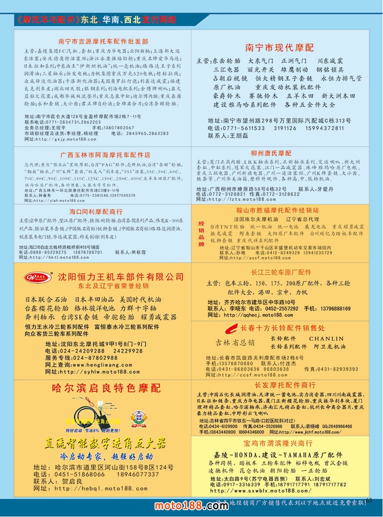 南寧國際汽摩城市場也有幾戶從中華路遷來,總數要比以前還要增加一些,我們一戶一戶核對了資料,不全的又補充登記,進行了比較細致的工作,同時增加了我們的發行網絡,爭取輻射中華路兩個市場和汽摩城市場。南寧的新市場金盈橋市場離市區稍遠一點,交通有點不太便利,下車后還要往山上走三、四百米。市場是一個大物流園,分一區、二區,一區有七八戶做配件的,部分人家作為倉庫。二區有三十多戶在經營,因為人流量少,以批發和送發貨為主,在市區內的部分商戶將這里作為倉儲,這里可以說是倉儲式的市場。從數量上講南寧的摩配電配經營商戶沒有減少,但是部分企業還是感嘆生意難做。