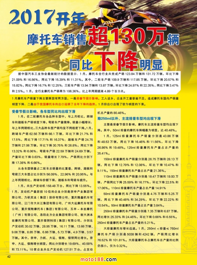 內42 2017開年摩托車銷售超130萬輛 同比下降明顯