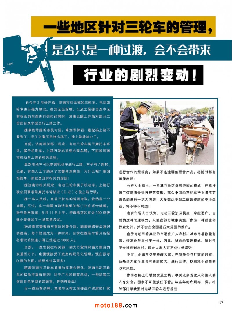 2017.6月《摩托車/電動車與配件》雜志,歡迎大家閱讀日期:2017-06-02 點擊:1297 查看原圖 全部展開![]() ![]() ![]() 內59 一些地區針對三輪車的管理,是否只是一種過渡,會不會帶來行 業的劇烈變動!
