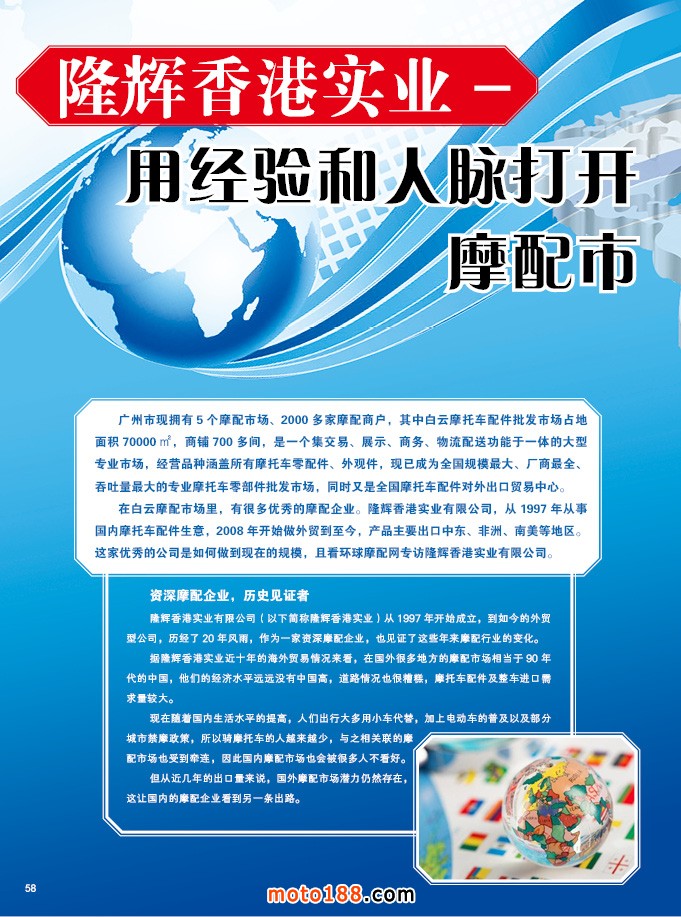 《外貿市場指南》發行對象:在廣州秋季全摩會首發,在明年春季全摩會繼續發行,全國所有的外貿企業、外商、全國所有的外貿摩配市場,目前需要在《中國摩配外貿市場指南》上做宣傳的企業十分踴躍,從計劃推出到正式操作不到一個月,已訂出一百五十個版面,我們爭取精心制作,確保準確性和適用性,將國內第一本外貿商業工具書做好。