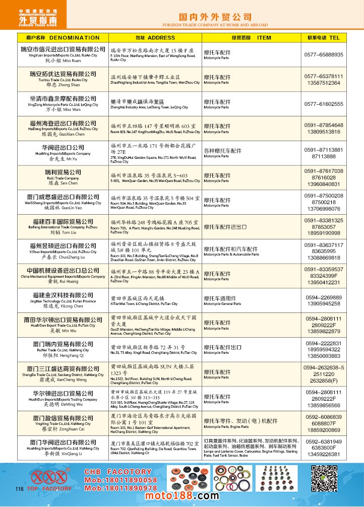 由《摩托車與配件》雜志社,在國內首次獨家推出的《中國摩托車配件外貿市場指南》工具書正式面世。這是一本專業定位于外貿企業的工具書,隨著一帶一路發展戰略的推進,更多企業走出國門,將產品銷往世界各地,本書收集了國內主要從事摩托車配件外貿的工廠、商家、國外部分駐華采購機構等資料匯總而成.