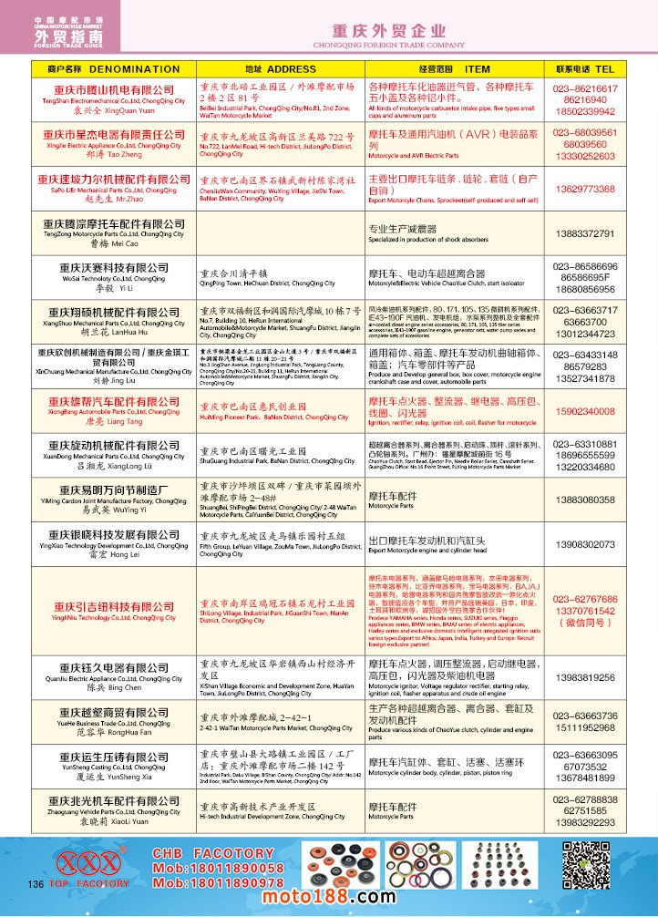 由《摩托車與配件》雜志社,在國內(nèi)首次獨家推出的《中國摩托車配件外貿(mào)市場指南》工具書正式面世。這是一本專業(yè)定位于外貿(mào)企業(yè)的工具書,隨著一帶一路發(fā)展戰(zhàn)略的推進,更多企業(yè)走出國門,將產(chǎn)品銷往世界各地,本書收集了國內(nèi)主要從事摩托車配件外貿(mào)的工廠、商家、國外部分駐華采購機構(gòu)等資料匯總而成.