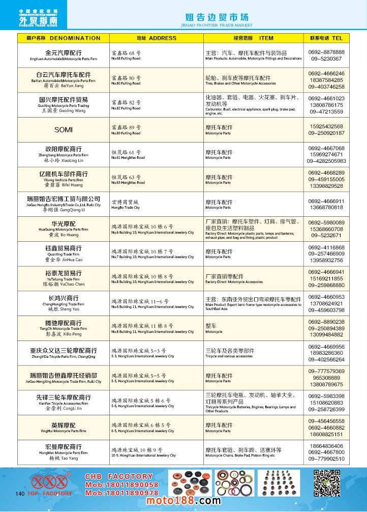 由《摩托車與配件》雜志社,在國內首次獨家推出的《中國摩托車配件外貿市場指南》工具書正式面世。這是一本專業定位于外貿企業的工具書,隨著一帶一路發展戰略的推進,更多企業走出國門,將產品銷往世界各地,本書收集了國內主要從事摩托車配件外貿的工廠、商家、國外部分駐華采購機構等資料匯總而成.