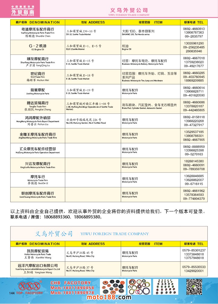 由《摩托車與配件》雜志社,在國內(nèi)首次獨家推出的《中國摩托車配件外貿(mào)市場指南》工具書正式面世。這是一本專業(yè)定位于外貿(mào)企業(yè)的工具書,隨著一帶一路發(fā)展戰(zhàn)略的推進,更多企業(yè)走出國門,將產(chǎn)品銷往世界各地,本書收集了國內(nèi)主要從事摩托車配件外貿(mào)的工廠、商家、國外部分駐華采購機構(gòu)等資料匯總而成.