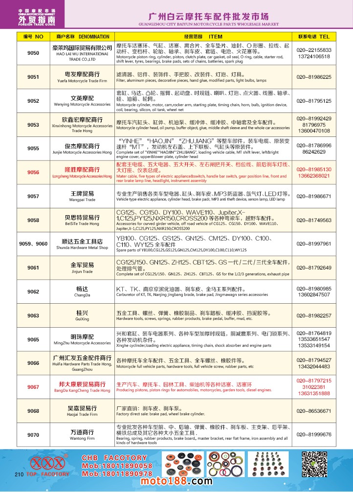 由《摩托車與配件》雜志社,在國內(nèi)首次獨家推出的《中國摩托車配件外貿(mào)市場指南》工具書正式面世。這是一本專業(yè)定位于外貿(mào)企業(yè)的工具書,隨著一帶一路發(fā)展戰(zhàn)略的推進(jìn),更多企業(yè)走出國門,將產(chǎn)品銷往世界各地,本書收集了國內(nèi)主要從事摩托車配件外貿(mào)的工廠、商家、國外部分駐華采購機構(gòu)等資料匯總而成.