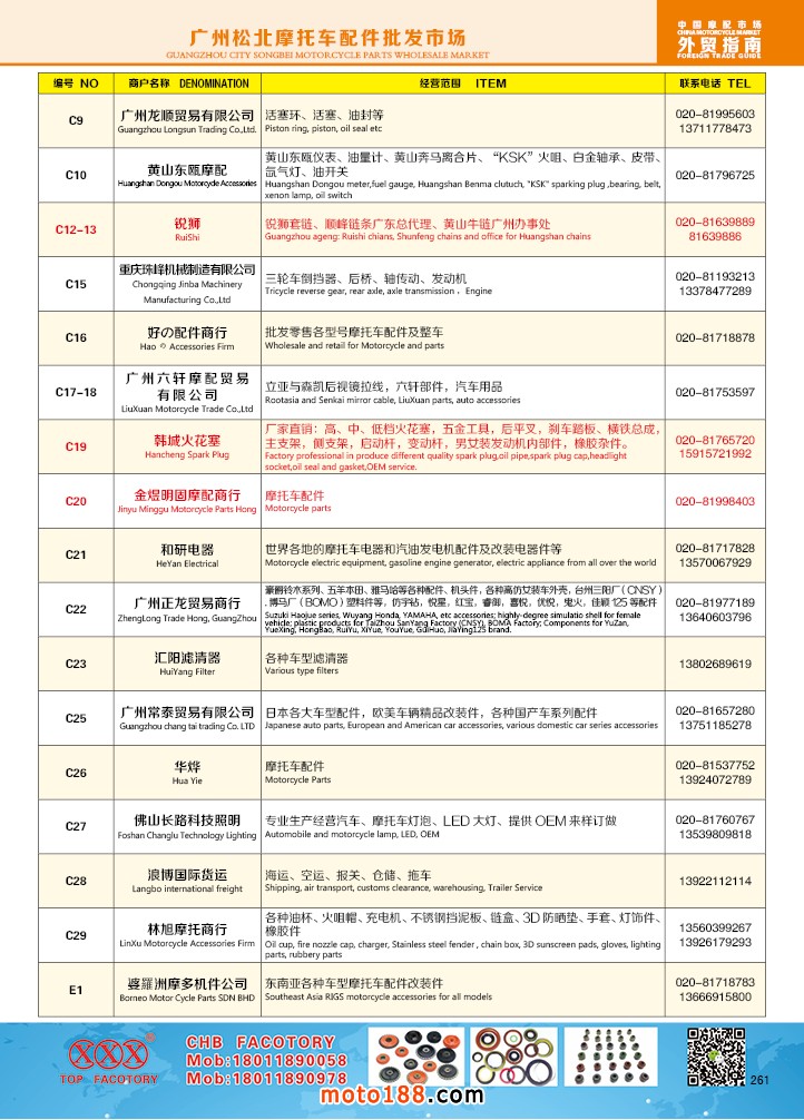 由《摩托車與配件》雜志社,在國內(nèi)首次獨(dú)家推出的《中國摩托車配件外貿(mào)市場指南》工具書正式面世。這是一本專業(yè)定位于外貿(mào)企業(yè)的工具書,隨著一帶一路發(fā)展戰(zhàn)略的推進(jìn),更多企業(yè)走出國門,將產(chǎn)品銷往世界各地,本書收集了國內(nèi)主要從事摩托車配件外貿(mào)的工廠、商家、國外部分駐華采購機(jī)構(gòu)等資料匯總而成.