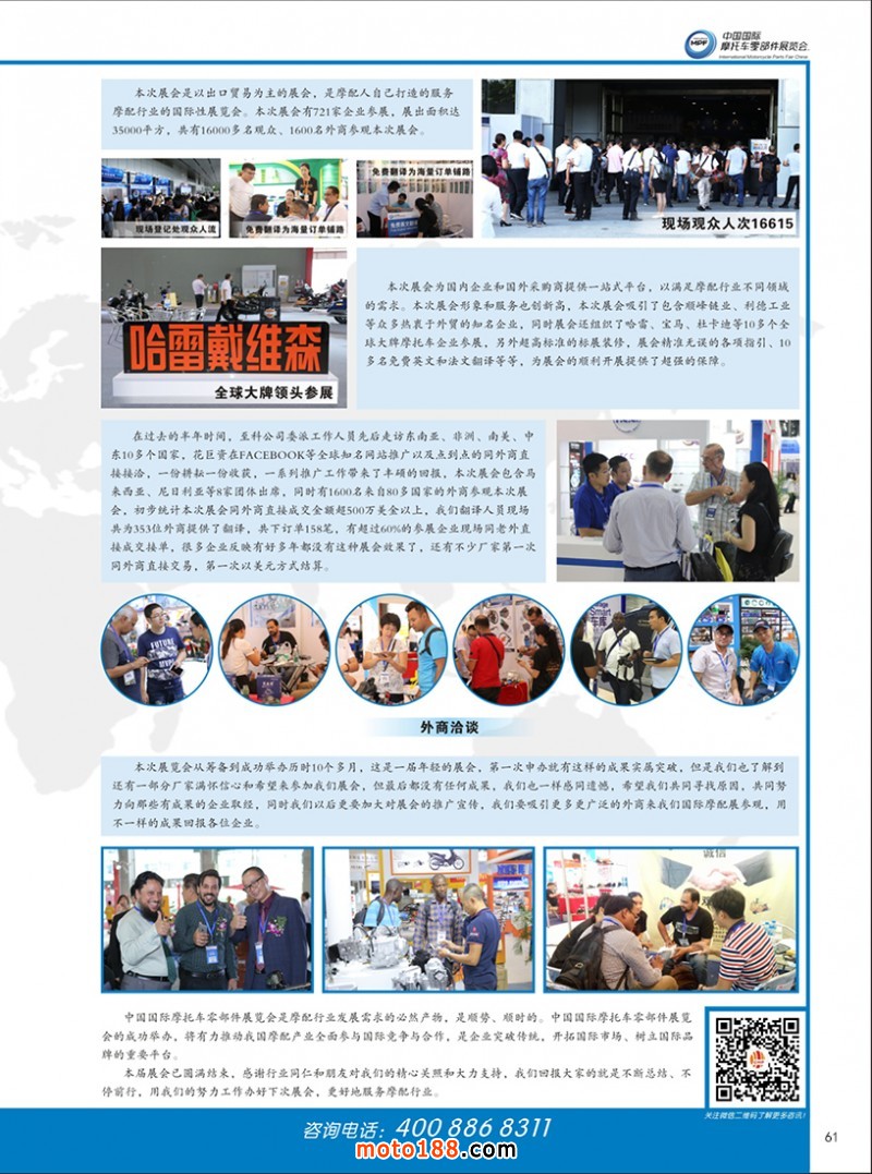 國內首本中英文雙語《中國摩配外貿市場指南》,為從事外貿的企業提供了工具。這本書在廣州秋季全摩會上首發。還將參加明年的江門和重慶春季全摩會。歡迎行業朋友帶上名片或者手機掃二維碼,到4079展位來領取《中國摩配外貿市場指南》和《摩托車與配件》11期雜志。