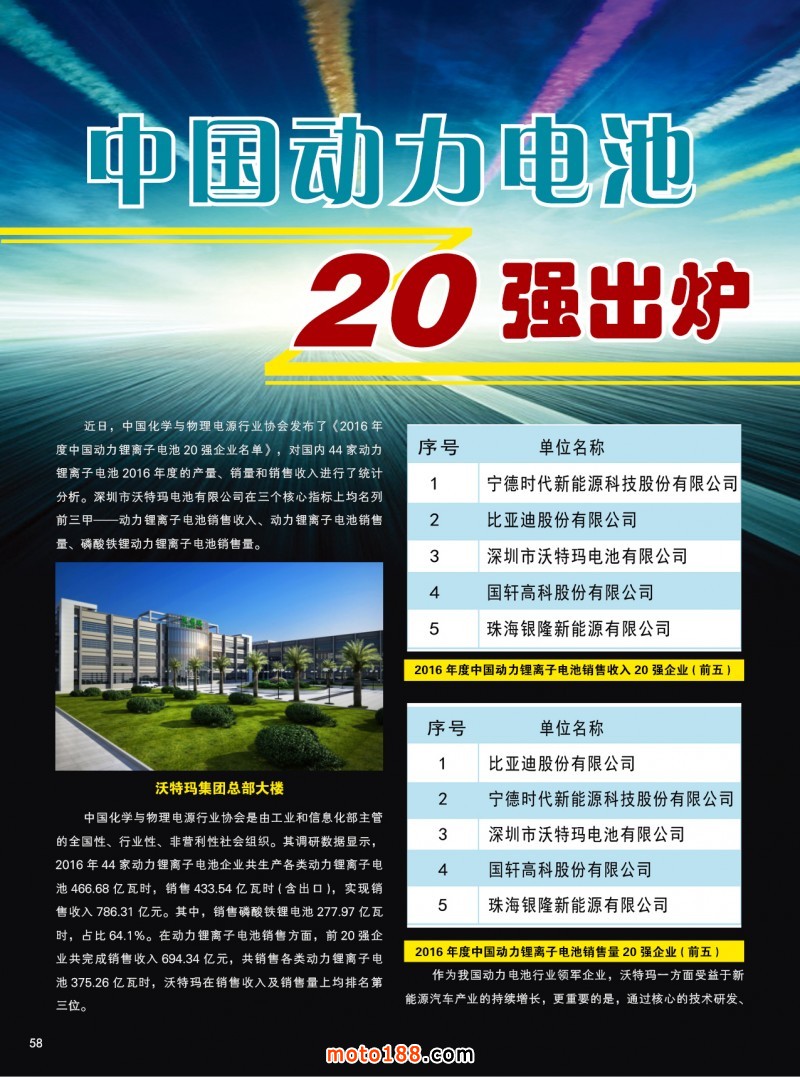 內58 中國動力電池20強出爐,沃特瑪穩居前三強