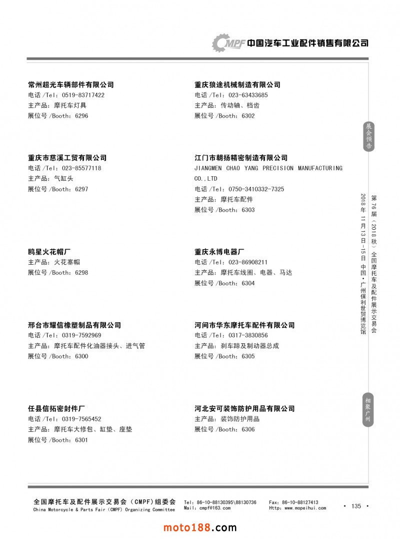 內(nèi)135 第75屆(2018春)全國摩托車及配件展示交易會-重慶站參展企業(yè)信息