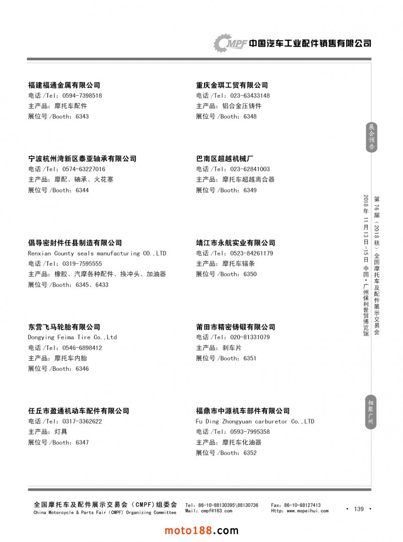 內139 第75屆(2018春)全國摩托車及配件展示交易會-重慶站參展企業信息