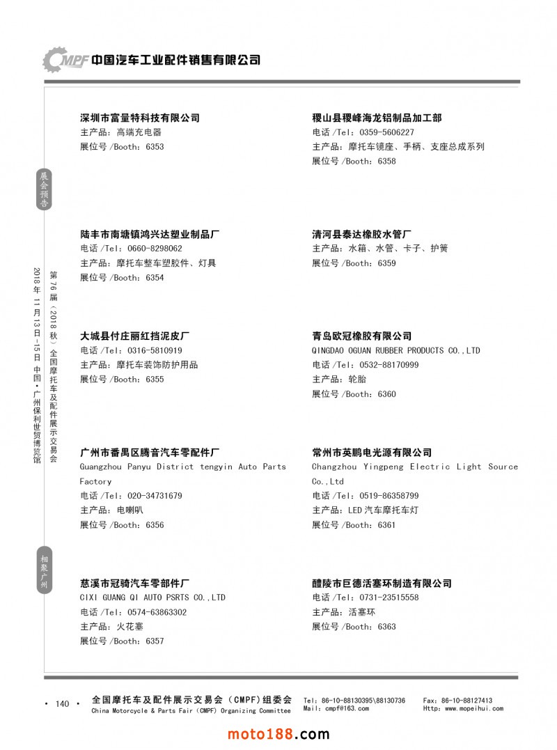 內(nèi)140 第75屆(2018春)全國(guó)摩托車及配件展示交易會(huì)-重慶站參展企業(yè)信息