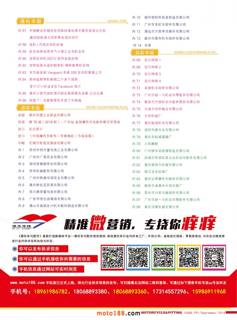 從現在到10月上旬,我們還將對16年編撰的《摩配華南市場指南》進行升級,中英文雙語出版,新版本將在下半年第76屆廣州全國摩托車及配件展示交易會首發,歡迎參展企業和參展觀眾到3109展位領?。辉趶V州、重慶摩配市場全面派送,在廣州福星、松南市場門口、及白云210/002/607三個檔口常年設立發行窗口;發行至廣州、重慶、江浙的主要廠家,目前收集整理、核對校正信息,編排翻譯的工作正在進行之中,需要在最新《華南市場指南》升級版做宣傳的企業,請和我們以及各地的工作站人員聯絡。