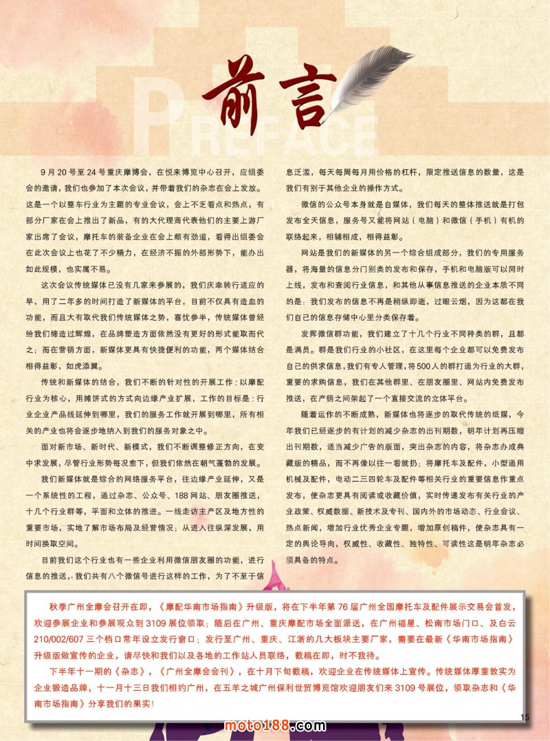 秋季廣州全摩會召開在即,《摩配華南市場指南》升級版,將在下半年第76屆廣州全國摩托車及配件展示交易會首發,歡迎參展企業和參展觀眾到3109展位領取;隨后在廣州、重慶摩配市場全面派送,在廣州福星、松南市場門口、及白云210/002/607三個檔口常年設立發行窗口;發行至廣州、重慶、江浙的幾大板塊主要廠家,需要在最新《華南市場指南》升級版做宣傳的企業,請盡快和我們以及各地的工作站人員聯絡,截稿在即,時不我待。