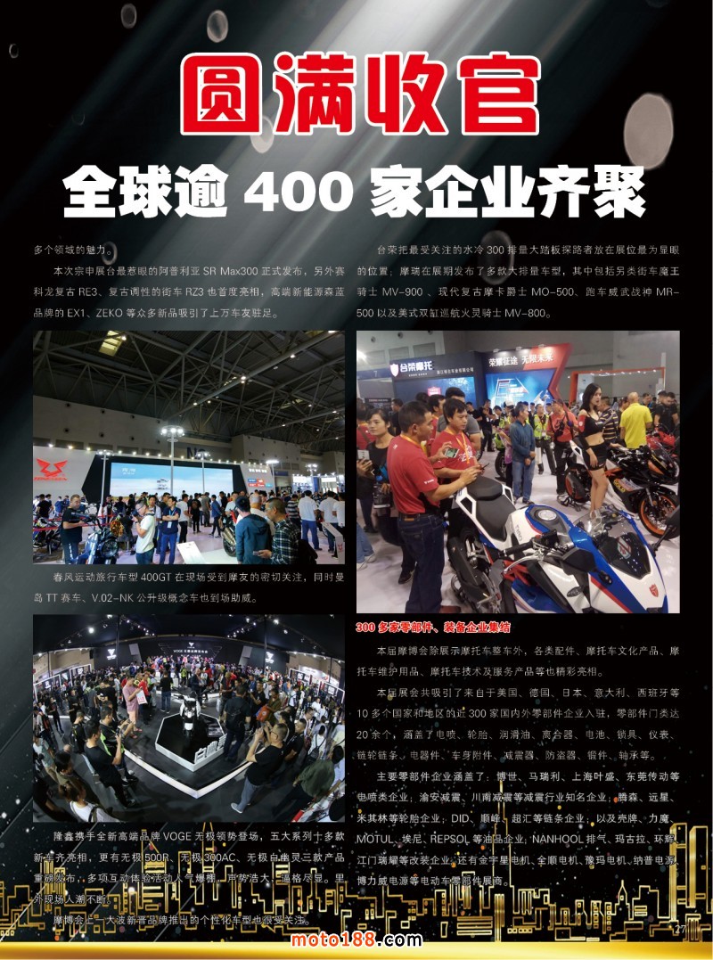9月20號至24號重慶摩博會,在悅來博覽中心召開,應(yīng)組委會的邀請,我們也參加了本次會議,并帶著我們的雜志在會上發(fā)放。這是一個以整車行業(yè)為主題的專業(yè)會議,會上不乏看點(diǎn)和熱點(diǎn),有部分廠家在會上推出了新品,有的大代理商代表他們的主要上游廠家出席了會議,摩托車的裝備企業(yè)在會上頗有勁道,看得出組委會在此次會議上也花了不少精力,在經(jīng)濟(jì)不振的外部形勢下,能辦出如此規(guī)模,也實(shí)屬不易。