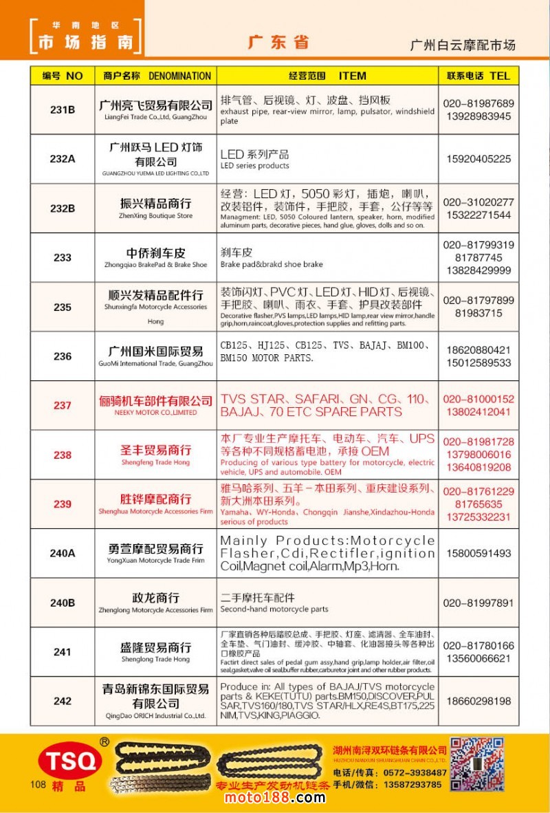 最新升級的《摩配華南市場指南》升級版在第76屆廣州全國摩托車及配件展示交易會上首發,歡迎朋友們來3109號展位。接著將在廣州、重慶摩配市場全面派送,在廣州福星、松南市場門口、及白云三個檔口常年設立發行窗口;發行至廣州、重慶、江浙的幾大板塊主要廠家及全國的主要摩配市場。