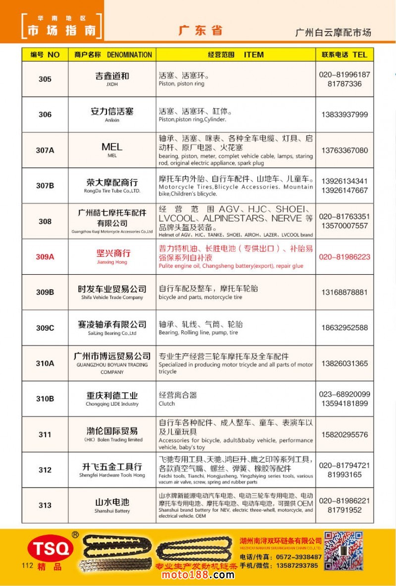 最新升級的《摩配華南市場指南》升級版在第76屆廣州全國摩托車及配件展示交易會上首發(fā),歡迎朋友們來3109號展位。接著將在廣州、重慶摩配市場全面派送,在廣州福星、松南市場門口、及白云三個檔口常年設立發(fā)行窗口;發(fā)行至廣州、重慶、江浙的幾大板塊主要廠家及全國的主要摩配市場。