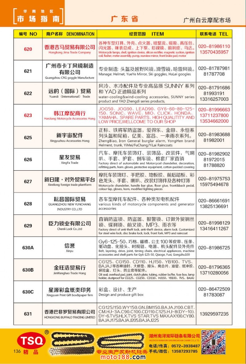 最新升級(jí)的《摩配華南市場指南》升級(jí)版在第76屆廣州全國摩托車及配件展示交易會(huì)上首發(fā),歡迎朋友們來3109號(hào)展位。接著將在廣州、重慶摩配市場全面派送,在廣州福星、松南市場門口、及白云三個(gè)檔口常年設(shè)立發(fā)行窗口;發(fā)行至廣州、重慶、江浙的幾大板塊主要廠家及全國的主要摩配市場。
