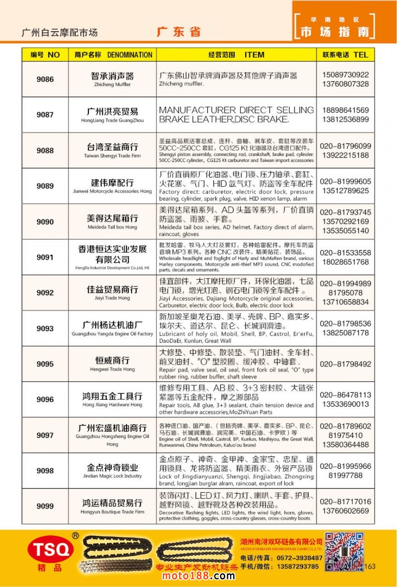 最新升級的《摩配華南市場指南》升級版在第76屆廣州全國摩托車及配件展示交易會上首發,歡迎朋友們來3109號展位。接著將在廣州、重慶摩配市場全面派送,在廣州福星、松南市場門口、及白云三個檔口常年設立發行窗口;發行至廣州、重慶、江浙的幾大板塊主要廠家及全國的主要摩配市場。