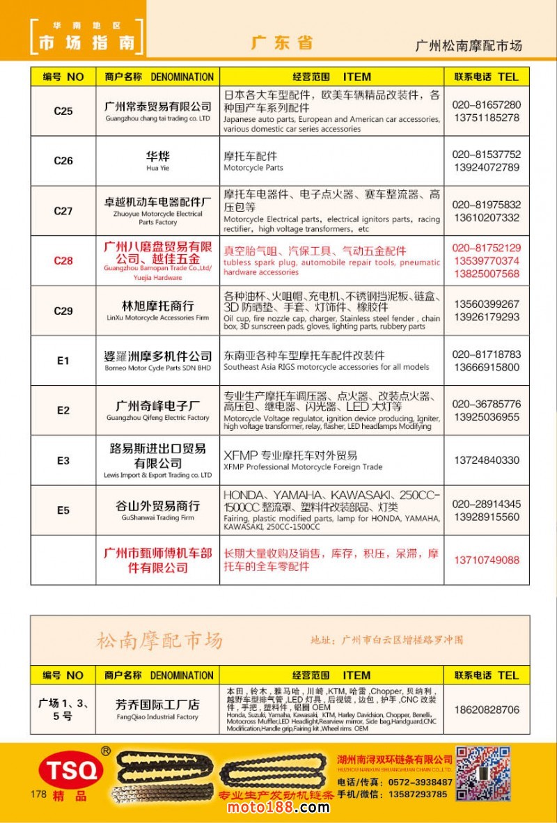 最新升級的《摩配華南市場指南》升級版在第76屆廣州全國摩托車及配件展示交易會上首發(fā),歡迎朋友們來3109號展位。接著將在廣州、重慶摩配市場全面派送,在廣州福星、松南市場門口、及白云三個檔口常年設(shè)立發(fā)行窗口;發(fā)行至廣州、重慶、江浙的幾大板塊主要廠家及全國的主要摩配市場。