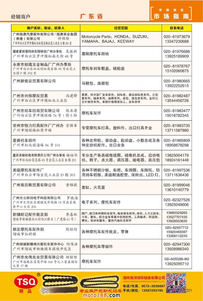 最新升級的《摩配華南市場指南》升級版在第76屆廣州全國摩托車及配件展示交易會上首發,歡迎朋友們來3109號展位。接著將在廣州、重慶摩配市場全面派送,在廣州福星、松南市場門口、及白云三個檔口常年設立發行窗口;發行至廣州、重慶、江浙的幾大板塊主要廠家及全國的主要摩配市場。