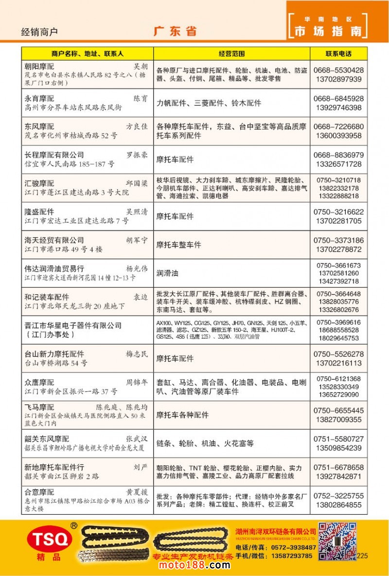 最新升級的《摩配華南市場指南》升級版在第76屆廣州全國摩托車及配件展示交易會上首發,歡迎朋友們來3109號展位。接著將在廣州、重慶摩配市場全面派送,在廣州福星、松南市場門口、及白云三個檔口常年設立發行窗口;發行至廣州、重慶、江浙的幾大板塊主要廠家及全國的主要摩配市場。