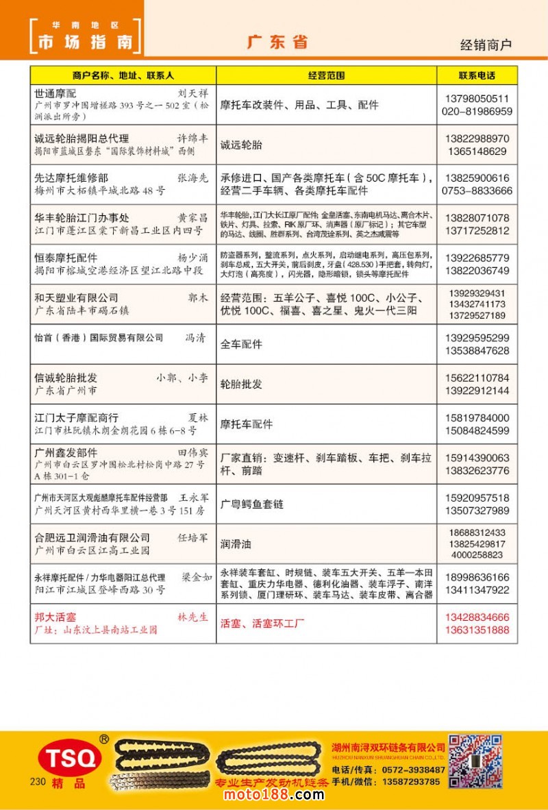 最新升級的《摩配華南市場指南》升級版在第76屆廣州全國摩托車及配件展示交易會上首發,歡迎朋友們來3109號展位。接著將在廣州、重慶摩配市場全面派送,在廣州福星、松南市場門口、及白云三個檔口常年設立發行窗口;發行至廣州、重慶、江浙的幾大板塊主要廠家及全國的主要摩配市場。