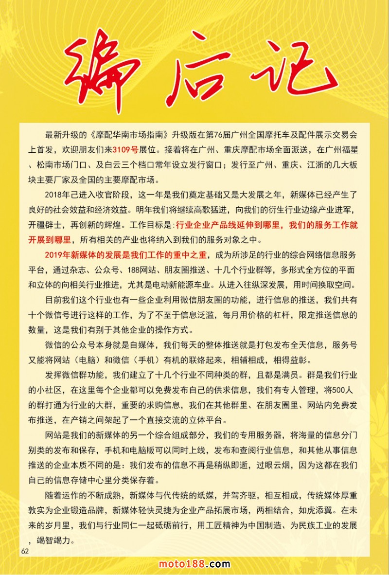 2019年新媒體的發展是我們工作的重中之重,成為所涉足的行業的綜合網絡信息服務平臺,通過雜志、公眾號、188網站、朋友圈推送、十幾個行業群等,多形式全方位的平面和立體的向相關行業推進,尤其是電動新能源車業。從進入往縱深發展,用時間換取空間。