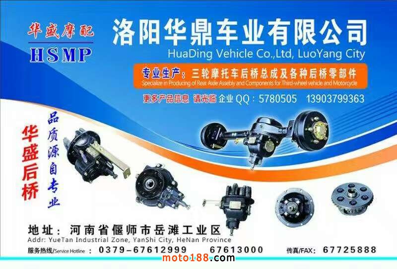 洛陽華鼎車業(yè)有限公司,專業(yè)生產(chǎn)三輪摩托車后橋總成及各種后橋零部件,聯(lián)系方式:0379-67612999、13903799363。