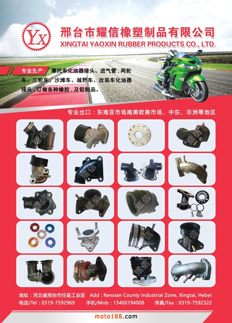 專業生產摩托車化油器接頭、進氣管,兩輪車、三輪車、沙灘車、越野車、改裝車化油器接頭,訂做各種橡膠及鋁制品。主要出口東南亞市場、南美