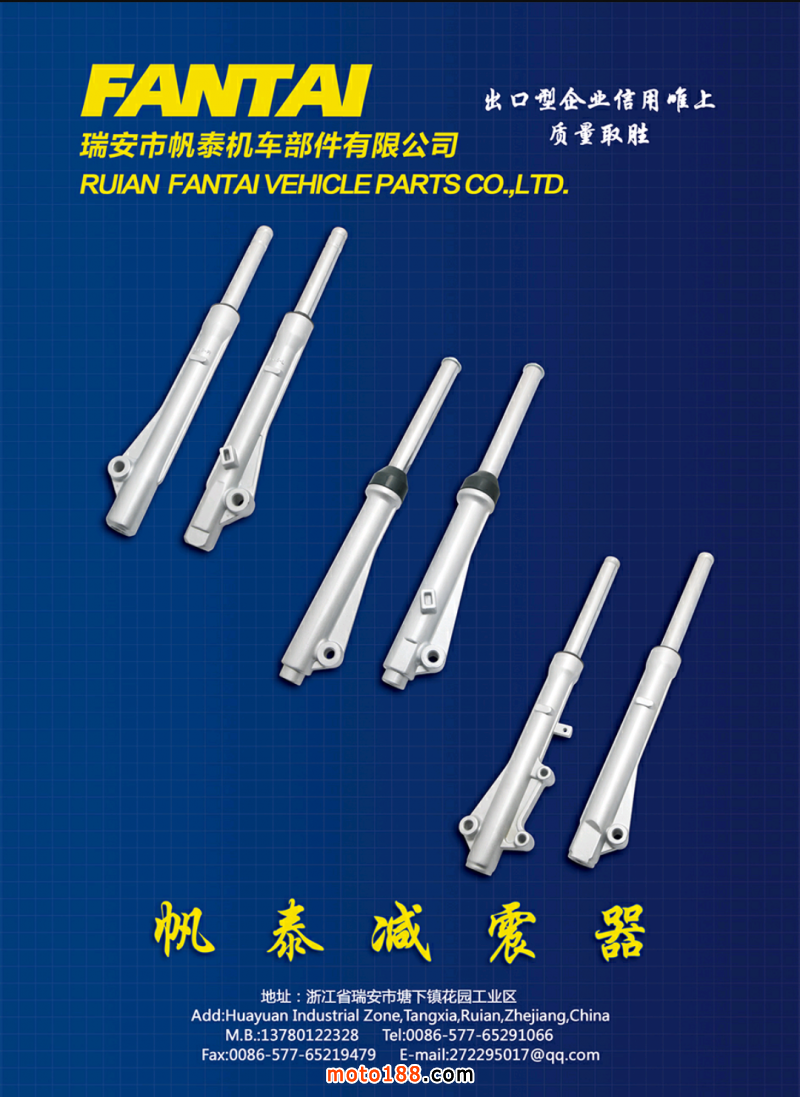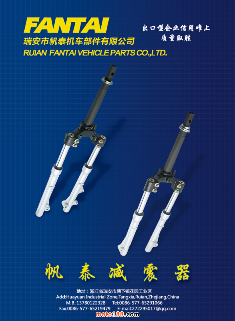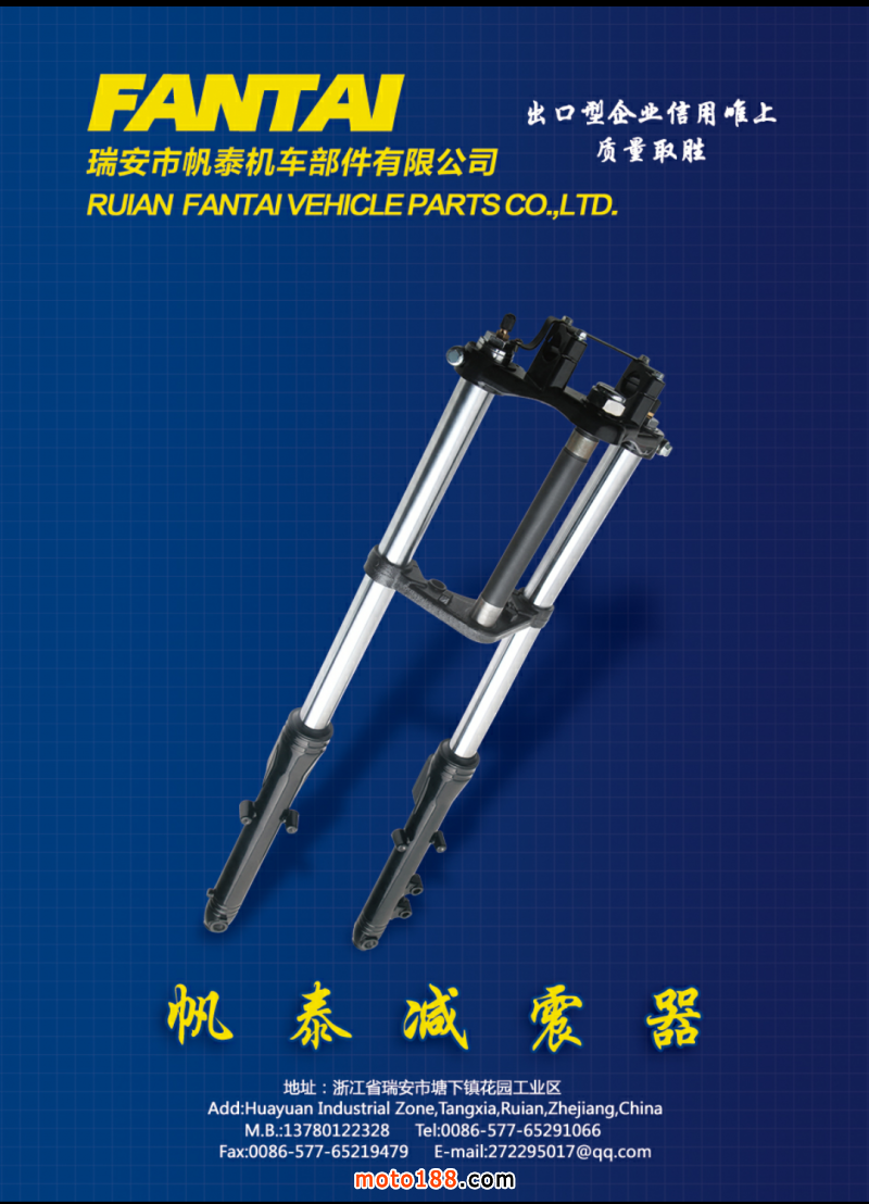 浙江省瑞安市帆泰機車部件有限公司,本公司專業生產摩托車前減震器,產品出口東南亞、南美等地區。聯系人:戴先生,手機:13780122328(微信同號)