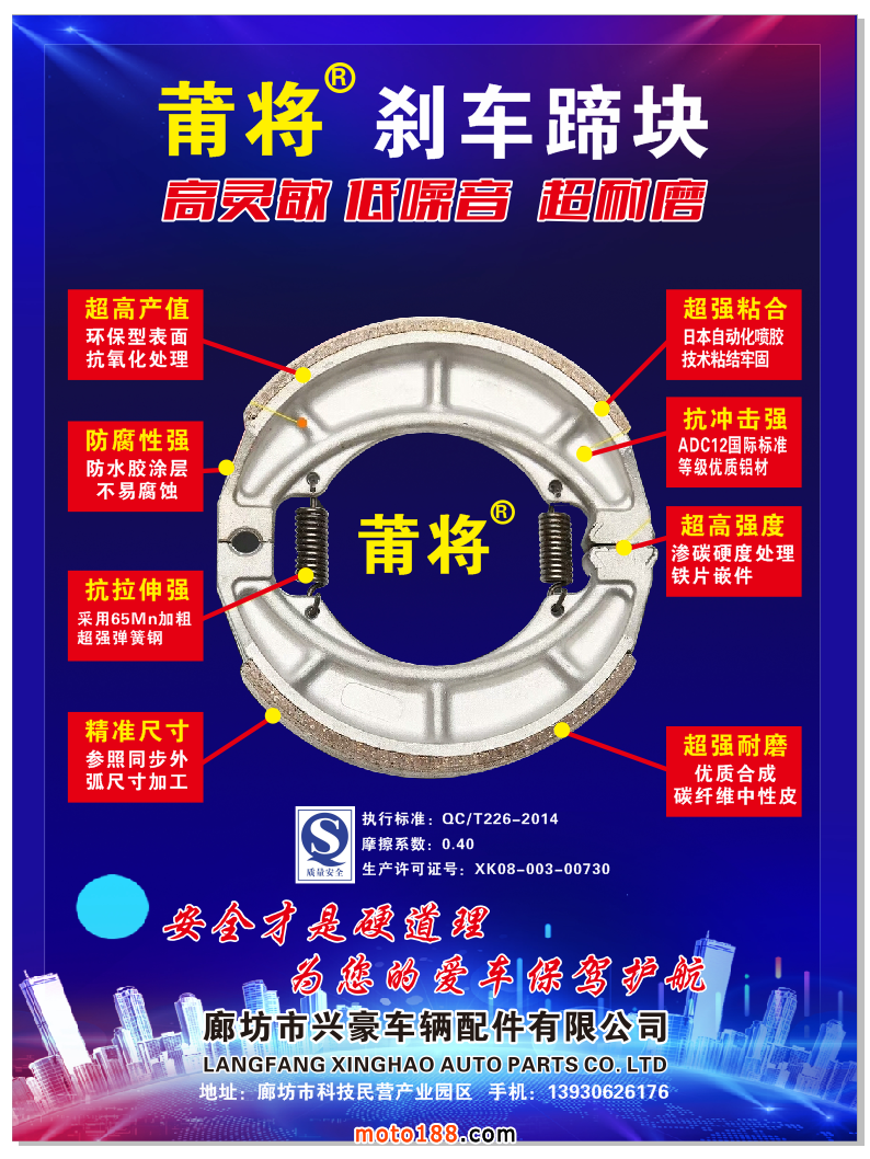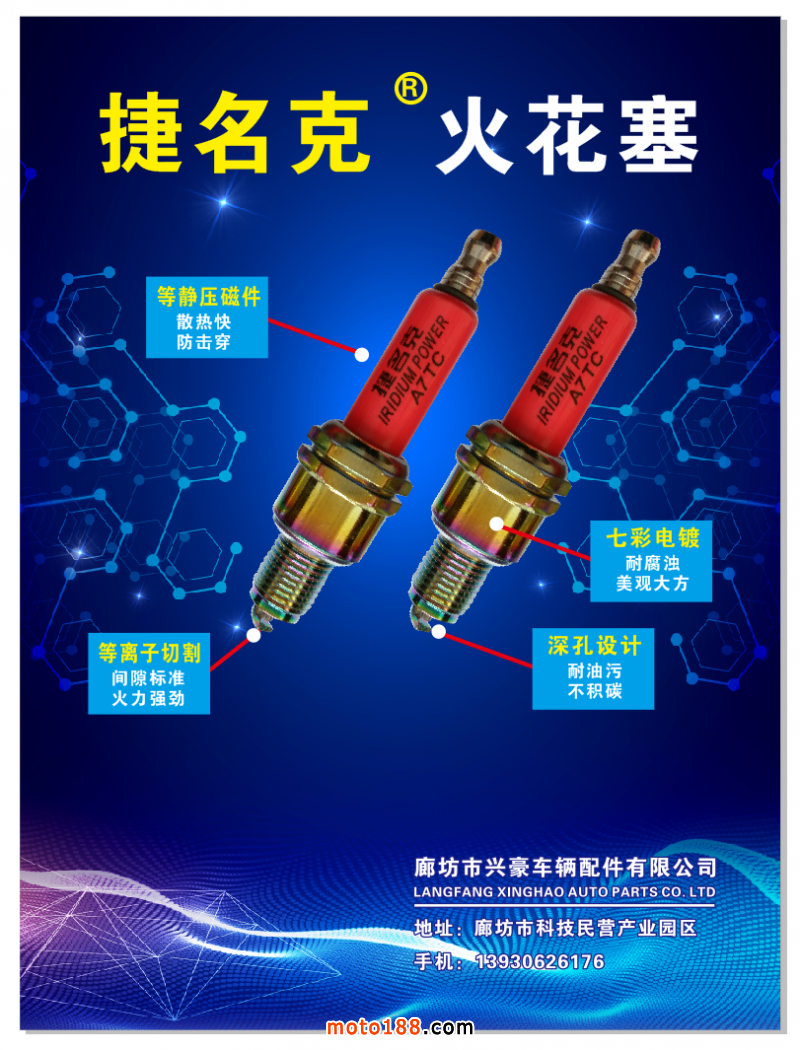 廊坊市興豪(中興)車輛配件有限公司分設(shè)摩托車制動(dòng)蹄塊生產(chǎn)廠區(qū)與汽車火花塞、摩托車火花塞、園林機(jī)械火花塞、工業(yè)火花塞生產(chǎn)廠區(qū)。本公司是一家集自主研發(fā)、生產(chǎn)、銷售為一體的綜合型企業(yè)!產(chǎn)品均通過ISO9001:2000國際質(zhì)量管理體系認(rèn)證。公司擁有完善的管理體系和質(zhì)量控制體系,嚴(yán)把質(zhì)量關(guān),把質(zhì)量比作公司的生命,把信譽(yù)比作與客戶溝通的橋梁。公司注冊商標(biāo)有莆將、悍江、捷名克、JEMIK等,所有產(chǎn)品性能穩(wěn)定,質(zhì)量可靠,價(jià)格合理,深受國內(nèi)外客商一致好評!我們以尋求高品質(zhì)為基礎(chǔ),以誠信經(jīng)營為理念,歡迎國內(nèi)外摩配界精英蒞臨指導(dǎo)!承接外貿(mào)訂單OEM貼牌。微信:13930626176,手機(jī):13930626176。