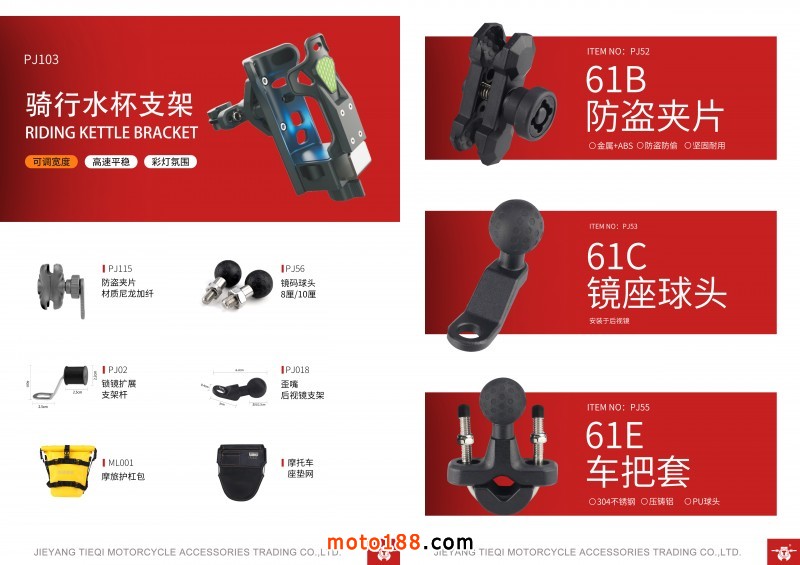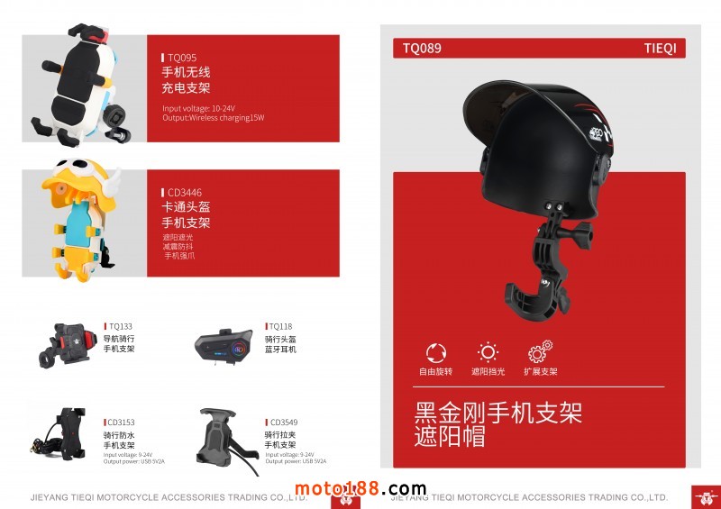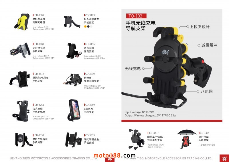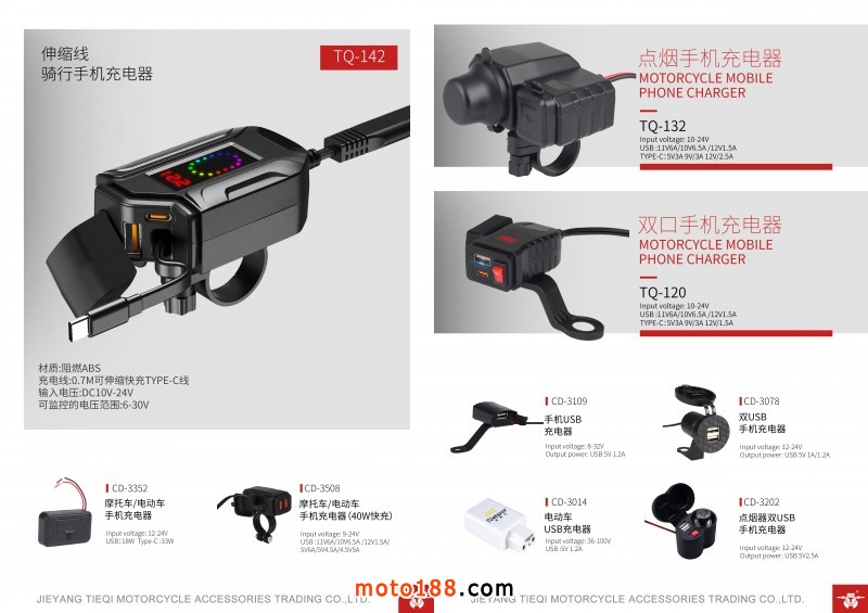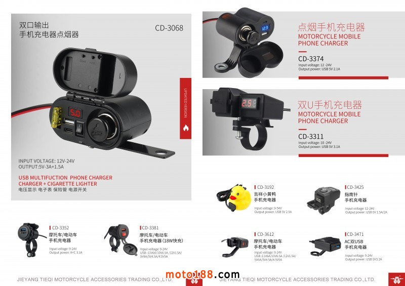 揭陽鐵騎摩托車配件貿易有限公司,主要生產摩托車、電動車、自行車、手機USB充電器和充電手機支架。我司已形成了獨立的模具開發設計、成品生產和高標準生產線。是一支集市場營銷工貿為一體的高效研發團隊。并銷往國內市場及多家知名出口貿易公司,出口到世界各地摩配行業。聯系人:楊經理,18200913975