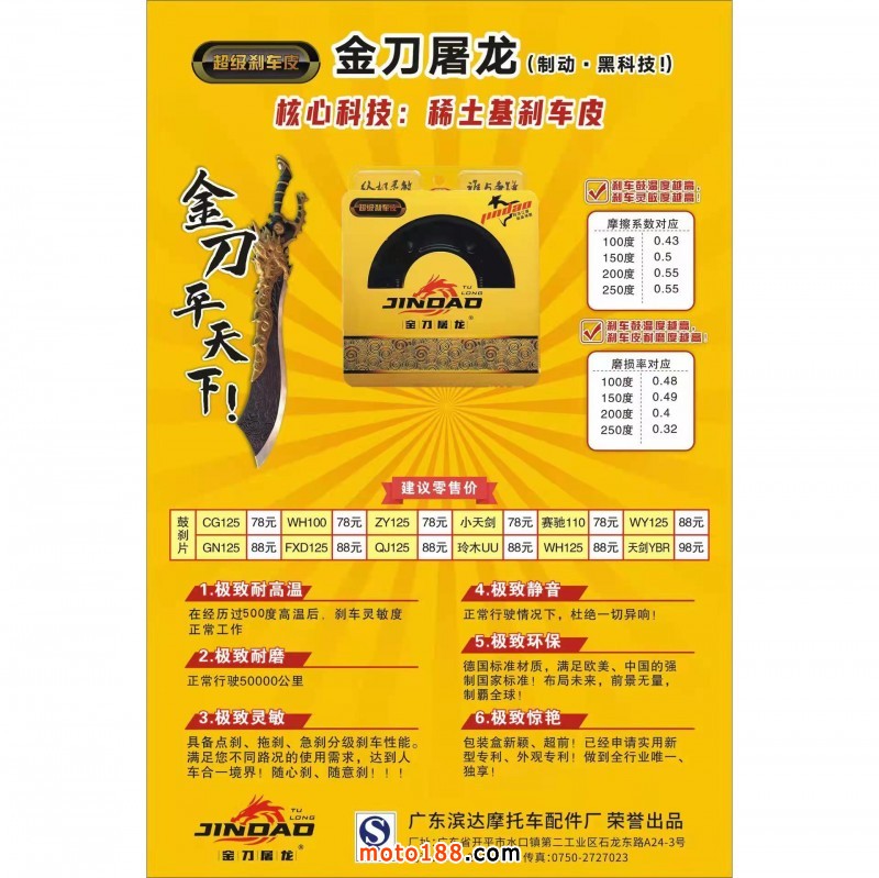 未來已來!!!金刀屠龍剎車皮是一款劃時代的產(chǎn)品。它是中國摩托車行業(yè)中第一款,以高含量稀土元素材料為基礎生產(chǎn)的摩托車制動系列。誠邀眼光獨到的您,強強聯(lián)合、群策群力共同爆破財富之門!