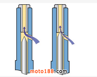 如果把一字調節螺母往內旋緊,圓柱形的針頭就會壓縮流通孔,避震的液壓阻力就會上升,相反的,如果向外旋松,阻力就會減小。