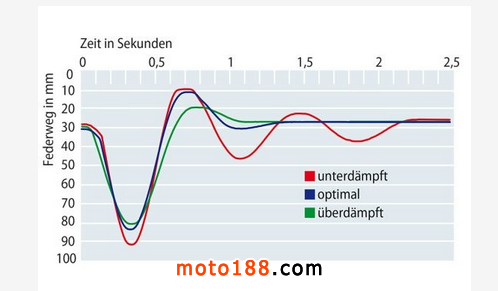 下圖中,縱軸表示彈簧的行程,橫軸表示時間。藍線是最佳狀態,紅線表示避震偏軟,恢復時間太長,需要加大。綠線表示避震偏硬,需要減小。
