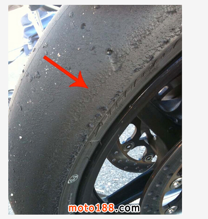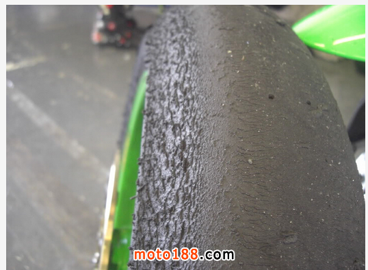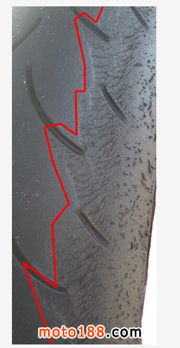 圖上這種狀況是前胎變形量不足,通常是前胎的負荷太小或是錯誤騎姿造成。負荷太小另一個結果就是溫度上不來,輪胎無法維持在工作溫度。