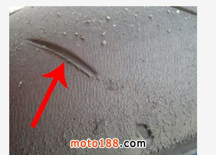 另一種狀況是整個輪胎都有撕裂痕,這通常代表太低的胎壓或是錯誤的騎乘姿勢,各類的撕裂痕出現的區域與狀況,都有它的原因,這里只是提供最基本的分析,各類撕裂痕的判讀是需要大量經驗的。