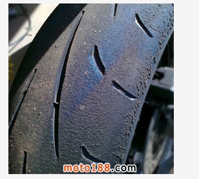 這類撕裂現象發生于沒熱胎狀況,或是輪胎并未保持在工作溫度;這當中的并未保持在工作溫度指的是,可能輪胎負載太低導致出發前熱胎套已經確實溫熱輪胎,但是騎乘中又冷下來了;但彎道中的高負荷依然局部的維持著溫度,所以變成局部承受高壓高溫。騎姿也會是因素之一。由于在直線時負載較均勻分布,彎道上負載狀況就較為極端多變,所以可能變成兩側仍在工作溫度中間已經冷掉的狀況。